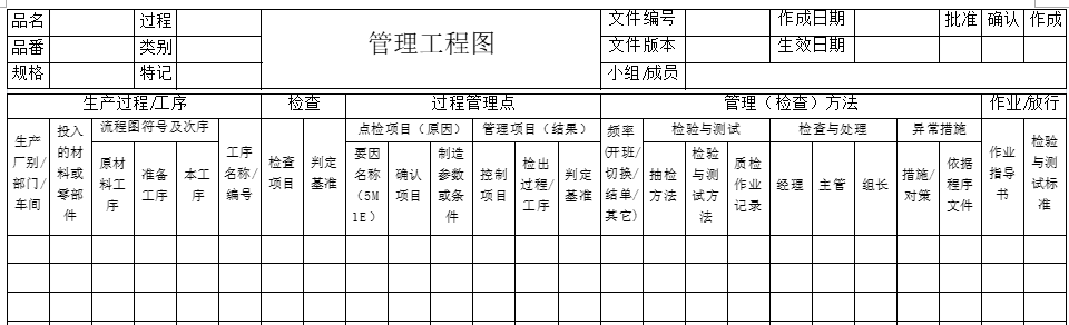 管理工程图是产品质量先期策划的输出,是过程控制的纲领性文件,也是管理生产过程的蓝图。其旨在通过具体控制方法的实施对过程进行监视和控制,最大限度地减少过程和产品变差,确保生产出符合顾客要求的产品。