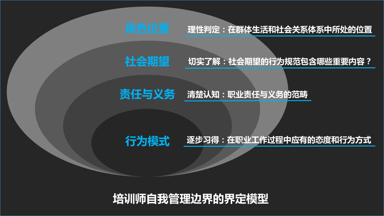 培训师作为一个职业身份和角色,也必定有其相对应的边界。因为任何一名培训师,除了在确定的职业场合中是一名培训师外,在其他更多的生活场景中,还有更多不同的身份和角色。