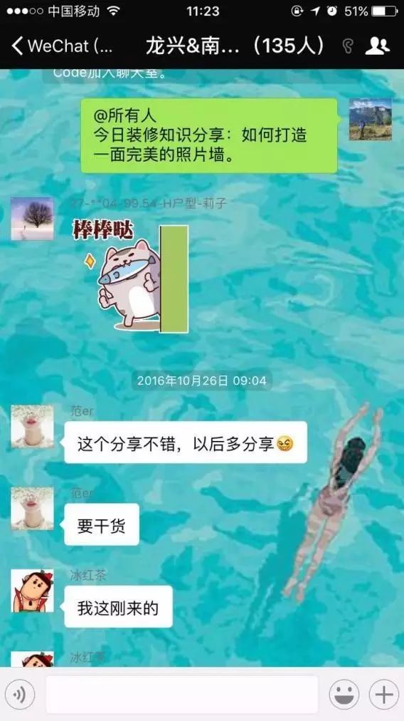 2) 每日早安干货——每天早上9点固定早安问候,分享装修知识并引导互动。用你的主号和群里的“自己人”聊天,制造互动很劲爆的氛围,吸引出潜水的业主参与互动。