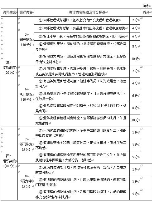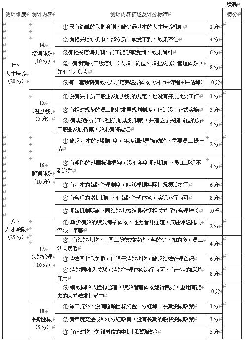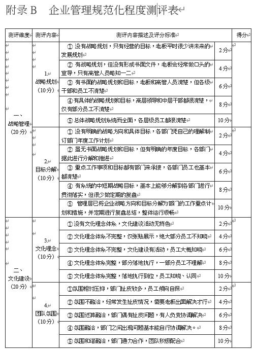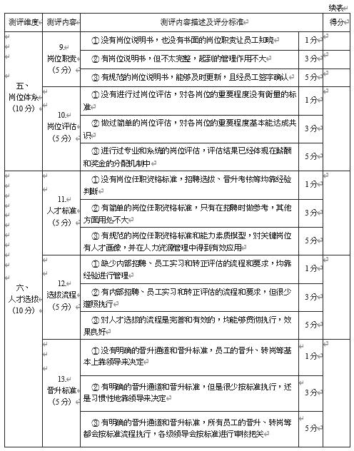 (2) 测评打分:将管理现状与测评标准进行对照,对每项内容按从低到高的顺序打分,分值为 1 ~ 10 之间的整数,不使用小数。