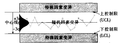 一般说来,可以用统计量T来代表。对于T的分布,我们认为它们是正态分布,可近似为正态分布。实际上,控制图是统计量T的正态分布图在时域上的具体展示,它是由T的中心线μ、上下限控制限μ±3σ和按时间顺序抽取样本并用统计量的数据点T这三个基本要素组成。对于服从或近似服从正态分布的统计量T,大约有99.73%的数据点会落在上下控制限之内,数据点落在上下控制限之外的概率约为0.27%。根据假设检验的小概率原则,一旦有界限之外的数据点出现,就可判断为异常点,即认为它们是由特殊因素造成的过程变异。