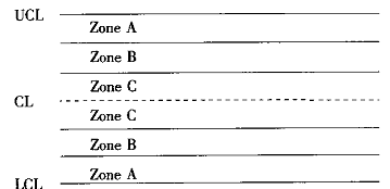 包括“点出界就判异”的准则在内,控制图共有8条判异准则用来判断过程是否受控。为了便于具体说明这8条准则,可将控制图分为6个区,每个区的宽度为σ。6个区的标号为A、B、C、C、B、A,两个A区、B区、C区都关于中心线对称,如图1-22所示。