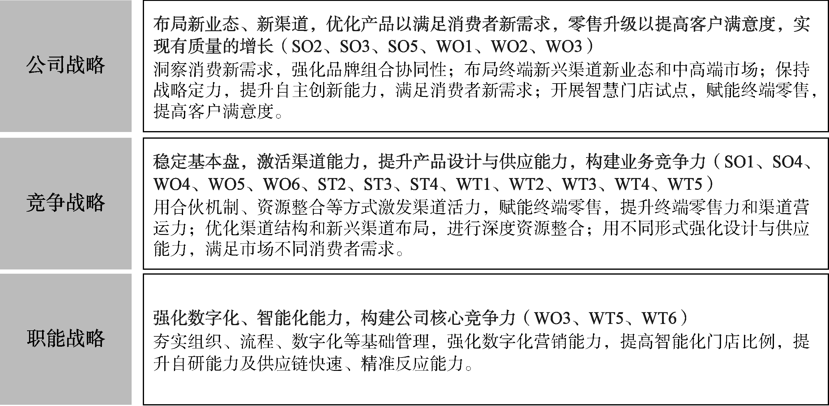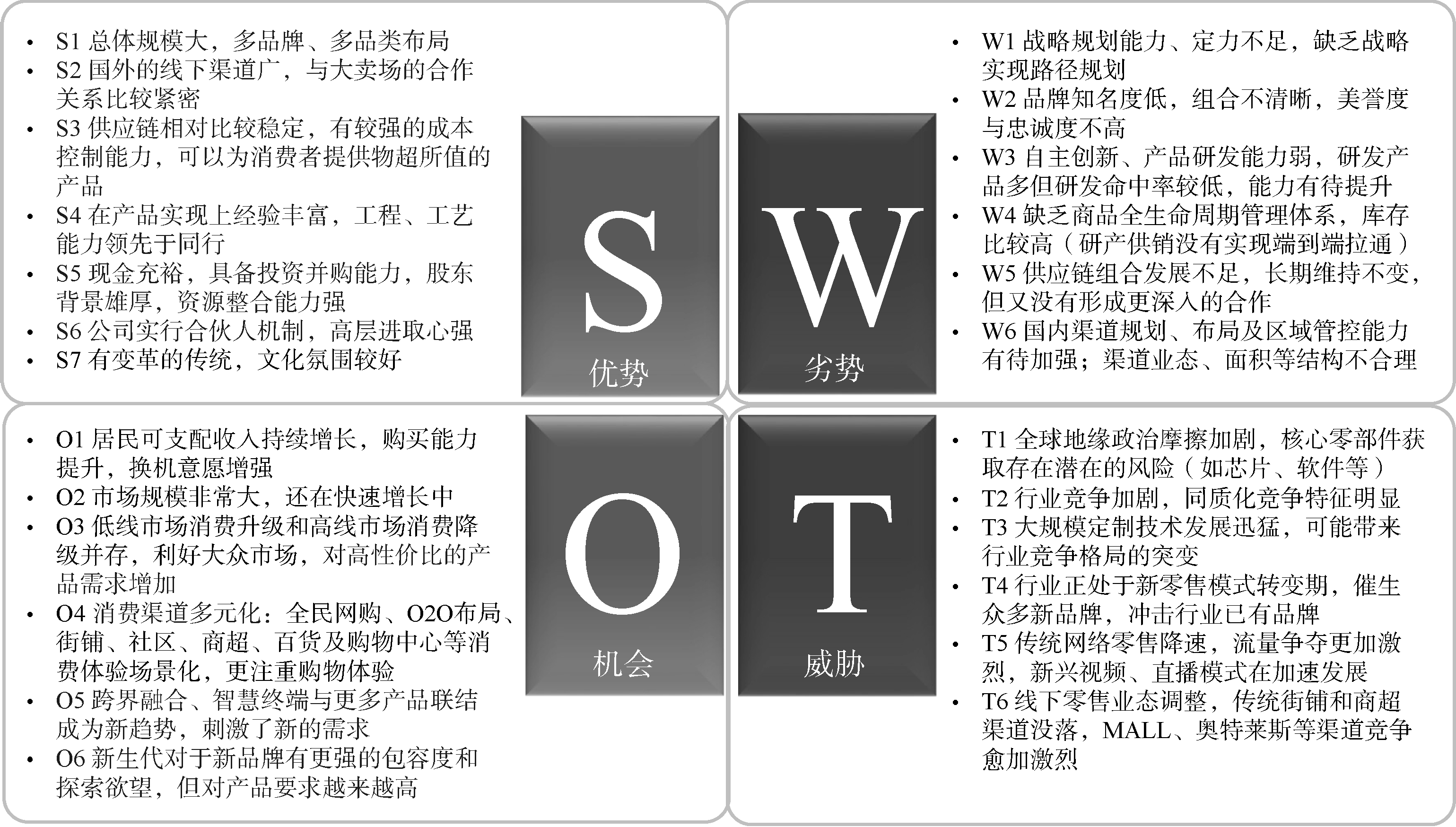 WO1 重新拟定品牌定位和组合策略,紧贴客户需求,中低端市场品牌与中高端市场品牌协同作战(W1、W2、O3、O6)