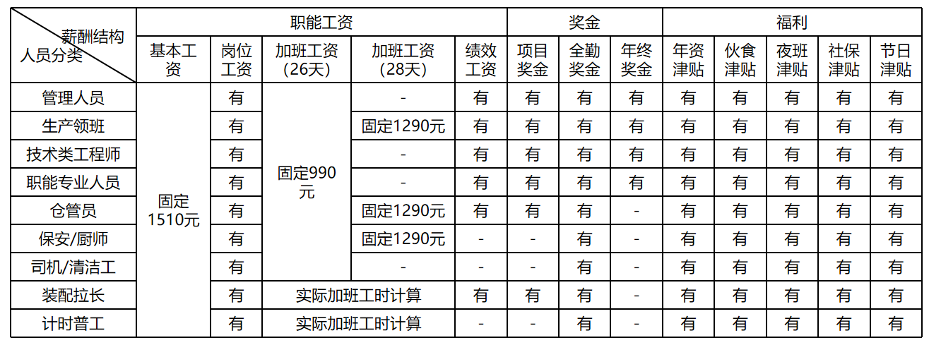 生产序列:生产类人员工作成果可具体量化,工作价值可直接评估、主要体现在业务流程生产环节,采用除基本薪资,绩效工资常以产能或计件薪酬组合。
