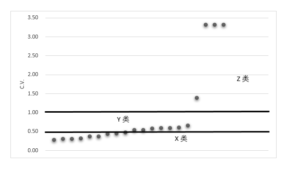 接着根据变异系数按照大小排序,系数在0.5以下的视为X类,系数超过1的视为Z类,剩下的则为Y类。