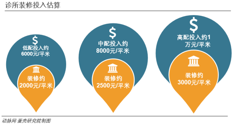 一家定位中高端的新型诊所,单店面积在500~1000平方米,总体投入为500万~1000万元。高配诊所会在更多的细分科室中进行器械投入,比如儿保器材、口腔科牙椅、眼科视光设备、X光影像设备等,都是较大的投入。