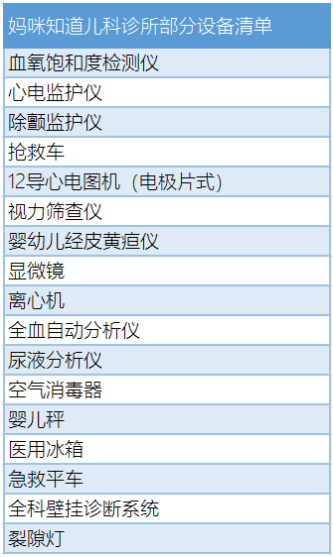 表3-1是妈咪知道儿科诊所的医疗器械采购清单,还采购了包括婴幼儿经皮黄疸仪、婴儿秤、裂隙灯在内的儿科常用器械。据透露,一家500平方米的诊所,设备采购约需要200万元。