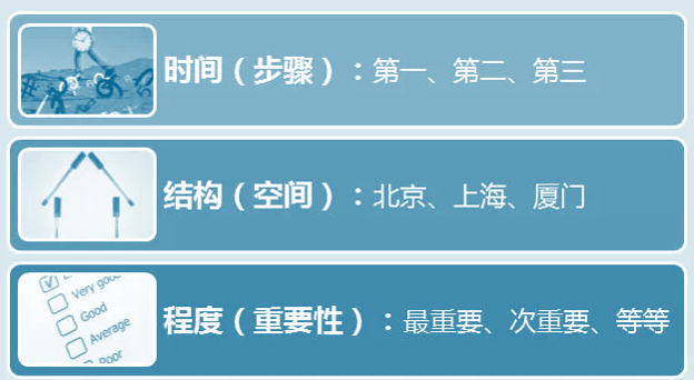 归纳式思维重在归纳,各要素之间存在共性。比如,华南市场销售额下降20%,华东市场销售额下降25%,华北市场销售额下降40%,这三个句子存在一个“市场销售额”的共性,可以作为“公司几大市场的销售面临问题”的论据。其中,归纳式思维又细分为3种表现顺序:时间顺序,空间顺序,重要性顺序。