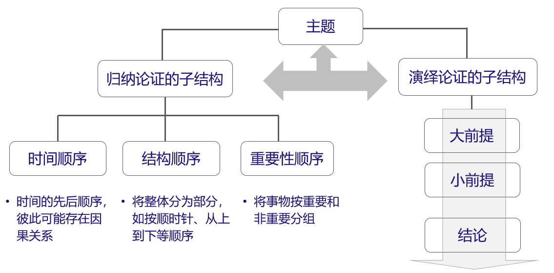 演绎式思维重在推理。比如:所有的人都会死,苏格拉底是一个人,所以苏格拉底会死。由一个大前提,到一个小前提,最后推导出一个结论,这就是演绎的思维结构。我们写作常用的Why-What-How结构就属于演绎式思维,先描述背景问题,或者重要性和价值,然后展开阐述相关原理,最后阐述具体的方法论,表达出观点和结论;还有递进结构,从事情的背景、发生到发展,最后到结果,层层递进,也是演绎式思维。
