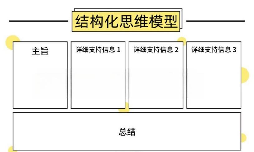 这个模型运用在汇报场景,百试不爽。在结构化123模型的基础上,概括出主旨之后,立马抛出支持信息,可以是论点,可以是论据,包括案例、故事、数据等各种形式,建议至少有3项支持信息,这样更有说服力。
