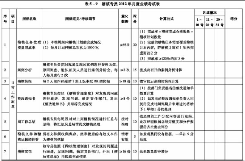 :第二,制定和推行《稽核专员考核方案》、《稽核员薪资和绩效奖金方案》。《稽核专员考核方案》如表5-9所示。