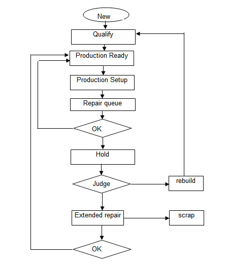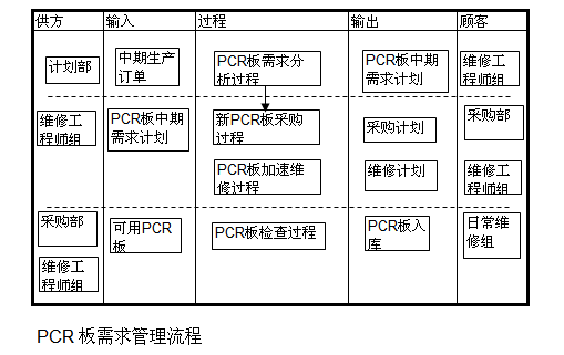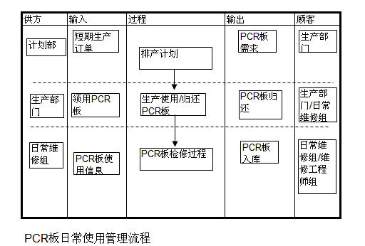 新PCR板采购,首先要经过验收(Qualify),验收合格后进入待生产使用状态(Production Ready)。生产部需要时领用,PCR板转为生产使用状态(Production Setup)。生产中PCR板出现故障或者转换产品时,生产线交回PCR板,PCR板处于待维修状态(Repair queue),随后PCR日常管理小组工人检查清理PCR板,将好的PCR板以及小的问题自行处理后的PCR板入库(转为待生产状态),有问题的PCR板转为限制使用状态等待工程师小组来处理。一部分PCR板由工程师小组自行维修后入库(待生产状态),另一部分PCR板交付给供应商维修,维修后的PCR板需要重新验收后才能入库。