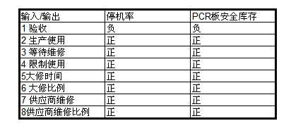 因果矩阵图:有2个关键的考核指标停机率以及采购成本,前面分析可以得知,采购成本只和PCR板安全库存成正比。因此输出参数为停机率和PCR板安全库存输入包括8个输入参数。