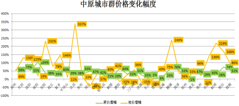 中原城市群房价平均涨幅为42%,地价平均涨幅为79%。房价涨幅高于城市群整体平均增幅的城市共有14个,分别为郑州、开封、洛阳、南阳、新乡、周口、信阳、濮阳、三门峡、聊城、菏泽、淮北、邢台、邯郸;地价涨幅高于城市群整体平均增幅的城市共有10个,分别为开封、洛阳、安阳、新乡、许昌、聊城、阜阳、蚌埠、邢台、邯郸。