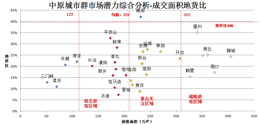 市场潜力从成交面积和地货比两个维度考虑,地货比较低且成交面积较大代表市场潜力较大。战略进驻区域城市共5个,分别为亳州、商丘、聊城、周口、鹤壁;重点关注区域城市共7个,分别为安阳、运城、阜阳、开封、信阳、焦作、邢台;机会进驻区域城市共9个,分别为济源、驻马店、新乡、长治、宿州、淮北、平顶山、濮阳、蚌埠。