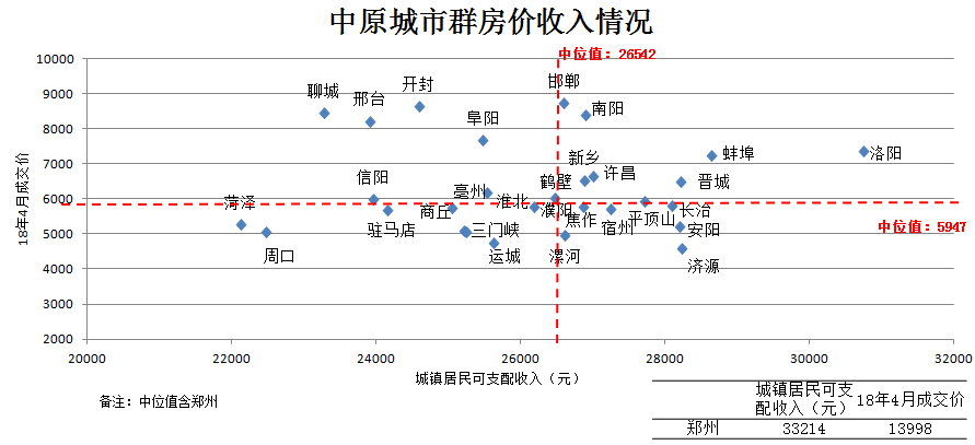 房价收入情况,在均值线下,居民收入较大且距离轴线向下偏离越大代表房价上涨潜力越强。重点关注城市有济源、安阳;一般关注城市运城、漯河、平顶山。