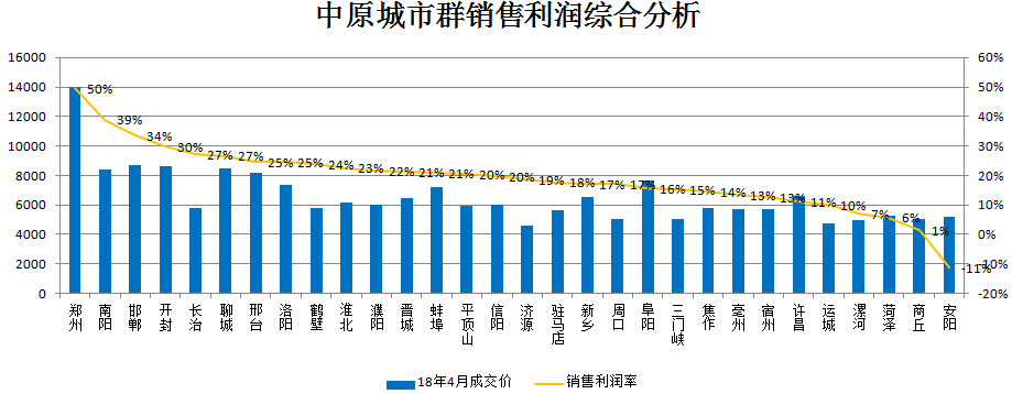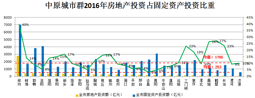 2016年中原城市群房地产投资额为8707.31亿元,占全国房地产投资额135284亿元的6.43%;房地产投资额在均值253亿元以上的城市有10个,分别是郑州、洛阳、新乡、信阳、阜阳、蚌埠、邯郸、菏泽、安阳、驻马店。房地产投资占固定资产投资比重超过25%的有3个,分别为郑州、毫州、阜阳,此区域房地产投资相对过热,建议谨慎拿地;介于15%至25%的有7个,分别为商丘、新乡、信阳、驻马店、菏泽、宿州、蚌埠,此区域为房地产合理投资区,建议重点关注;在15%以下的城市有16个,此区域房地产投资相对较少,存在潜在投资机会。