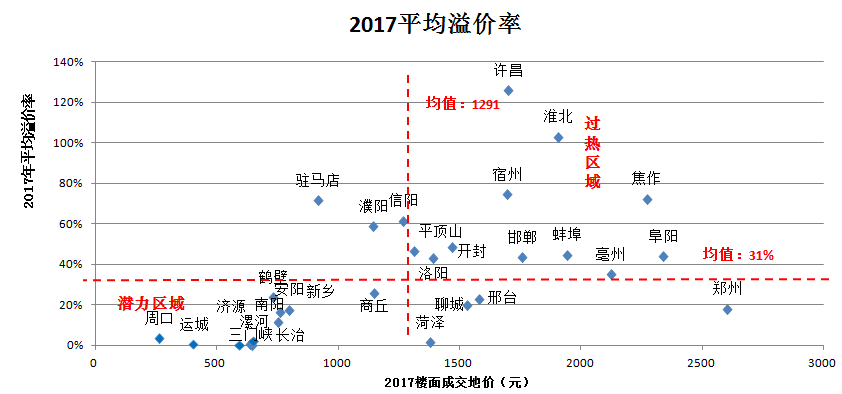 土地市场热度从成交楼面地价和溢价率两个维度考虑,成交楼面地价和溢价率均较低代表土地市场潜在热度较大。重点关注城市有鹤壁、安阳、南阳、商丘、新乡等。(溢价率在5%以下市场公开程度较低,需谨慎关注。)