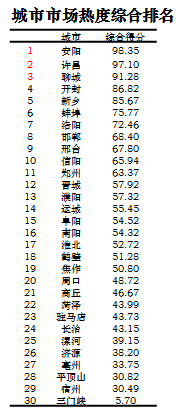 中原城市群城市市场热度综合排名TOP3的城市为:安阳、许昌、聊城。