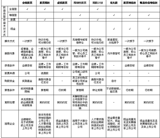 总的来说,业绩股票、股票期权、虚拟股票、和股票增值权、账面价值增值权等期权类激励模式中,当股票贬值时激励对象可以放弃行权,避免承担股权贬值的风险;而限制性股票、期股等激励模式,激励对象都必须购买股票,因此有承担相应损失的风险,约束性较强;而优先股作为一种优质的融资手段,购买者有因企业经营不善不能偿付的风险;当然,有的企业在设计业绩股票时会设置风险保证金,此时业绩股票也有承担相应损失的风险。