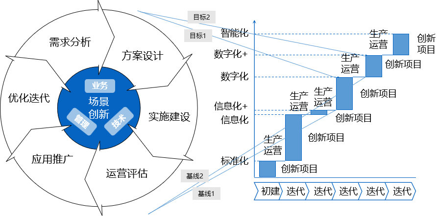 场景需求分析包括能力准备和需求分析:首先具备场景创新基本能力要素,包括组织人才、技术核心方法、战略目标等;先期以调研的形式做关键干系人的需求征集和分析分解,并持续开放需求搜集的渠道,及时输入到后续各个环节。场景方案设计包括架构设计和方案设计:架构阶段对业务、数据、应用、技术做逐层架构,形成各层面基线架构和目标架构;方案阶段通过基线与目标的差异,确定改革点,并合并成项目包,制定实施方案计划。场景实施建设包括实施建设和项目管理:按项目包排列的进度计划组织资源开展实施建设,并持续对接需求;采用科学的项目管理办法控制整个实施建设过程,尤其关注质量、进度、成本。场景运营评估包括生产运营和评估治理:在生产中实际应用场景建设成果,形成平稳的运营状态;持续评估本场景的数字化转型成熟度,以专家委员会等组织作为专业治理。场景应用推广包括应用扩散和需求孵化:发挥场景的可复制优势,将应用成果扩散到其他单元、其他部门、其他企业,在不同单元、部门、企业的应用中,继续孵化新需求,为进一步改造做准备。场景优化迭代包括需求变更和过程迭代:对需求的变化抱开放态度,以有效的变更管理持续满足真实需求;整个过程并非固化的流动,而是允许在不同过程间穿插,灵活迭代。