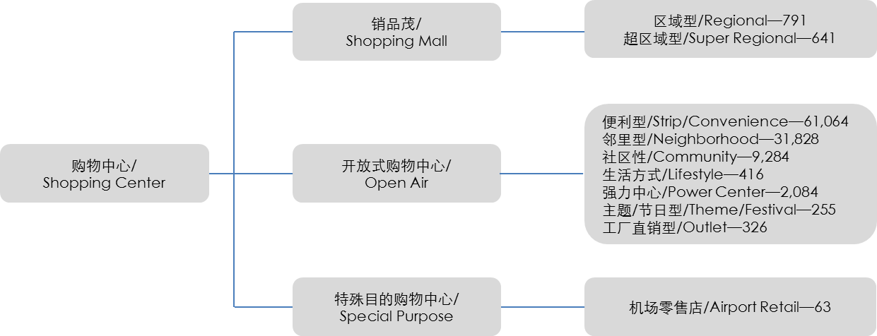 在美国购物中心中,沿街/便利购物中心(Strip/Convenience Center)、邻里购物中心(Neighborhood Center)和社区购物中心(Community Center)是数量最多的三类购物中心,占比分别达到了57%、30%和8%,平均面积从13,684平方英尺(约1271平方米)到195,612平方英尺(约18172平方米)不等,相比其他类型的购物中心,很明显,美国大部分购物中心是小型化的。
