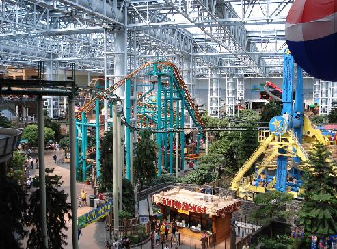 美国摩尔购物中心(Mall of America)位于明尼苏达州布鲁明顿市,作为全美最大的购物娱乐中心,拥有大大小小40多家餐馆,包括在中国也能见到的麦当劳、必胜客和热带雨林餐厅。商城中央有占地面积达2.8万平方米的“史努比营”主题游乐园,还有一座由14个影厅组成的电影院和8家夜间娱乐场所。目前商城的出租率已达到了99%。根据估算,即使只在每家店呆10分钟,转遍所有的店也需要花上86个小时。同时根据相关统计,每年到这里购物的人比到迪士尼乐园、大峡谷旅游的总和还要多,年客流量达到4250万人次。如图4-3所示。