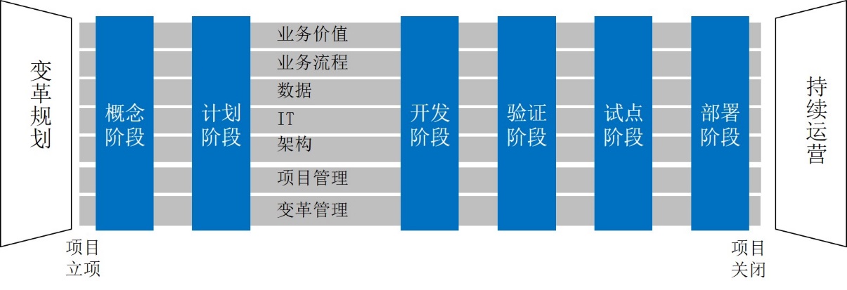这个数字化转型管理框架要从横向和纵向两个维度看。横向是数字化转型涉及到的各个管理要素,包括:业务价值、业务流程、数据、IT、架构、项目管理和变革管理;纵向是数字化转型的几个阶段,包括:变革规划、概念阶段、计划阶段、开发阶段、验证阶段、试点阶段、部署阶段和持续运营。横向的管理要素有七个,纵向则分为八个阶段,所以又有又有“七横八纵”管理框架的别称。业务流程是整个数字化转型方案中的关键一环,与数据、IT、架构共同构成了数字化转型的解决方案。