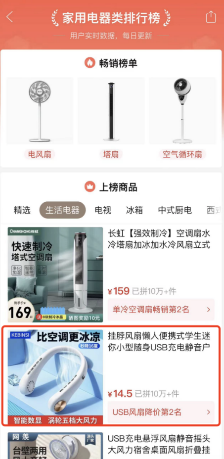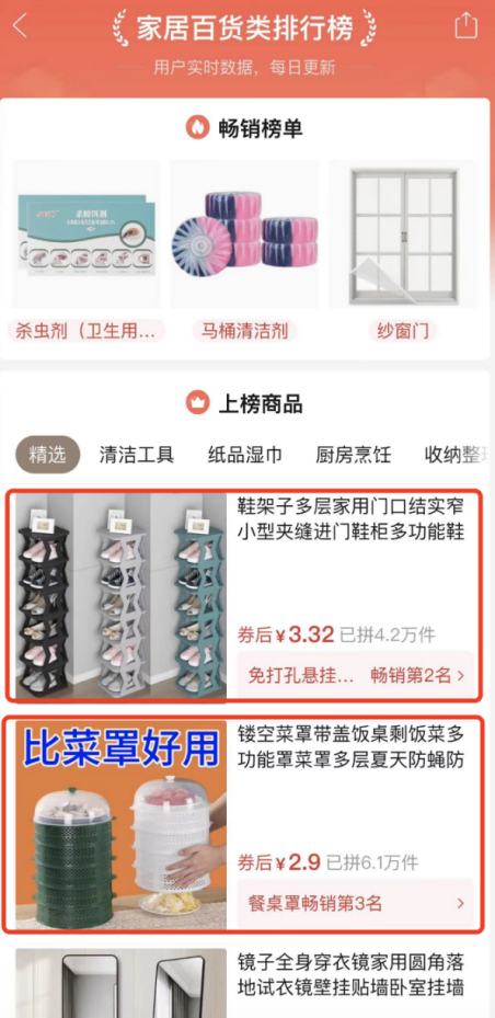 在拼多多的类目榜单里,先统计不同类目里的热销产品,比如家用电器类排行榜和家居百货类排行榜,如图7.1所示。