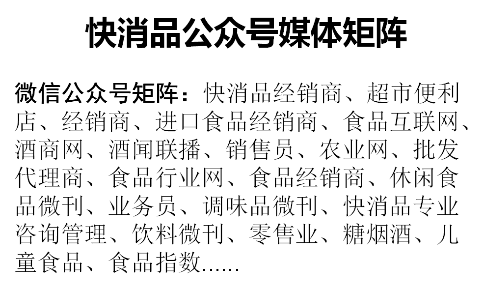 运营公众号媒体矩阵初期,我们先梳理出快消品行业的大类目和细分品类,提炼出行业关键词,作为账号名字使用。每一个关键词账号,内容完全垂直,只吸引垂直粉丝。粉丝积累到一定程度,公司将所有的账号粉丝,迁移到“快消品经销商”(后更名纳食)上,最终打造了食品行业最大的粉丝平台,成了快消品行业的门户。这就是微信公众号媒体矩阵的典型应用。