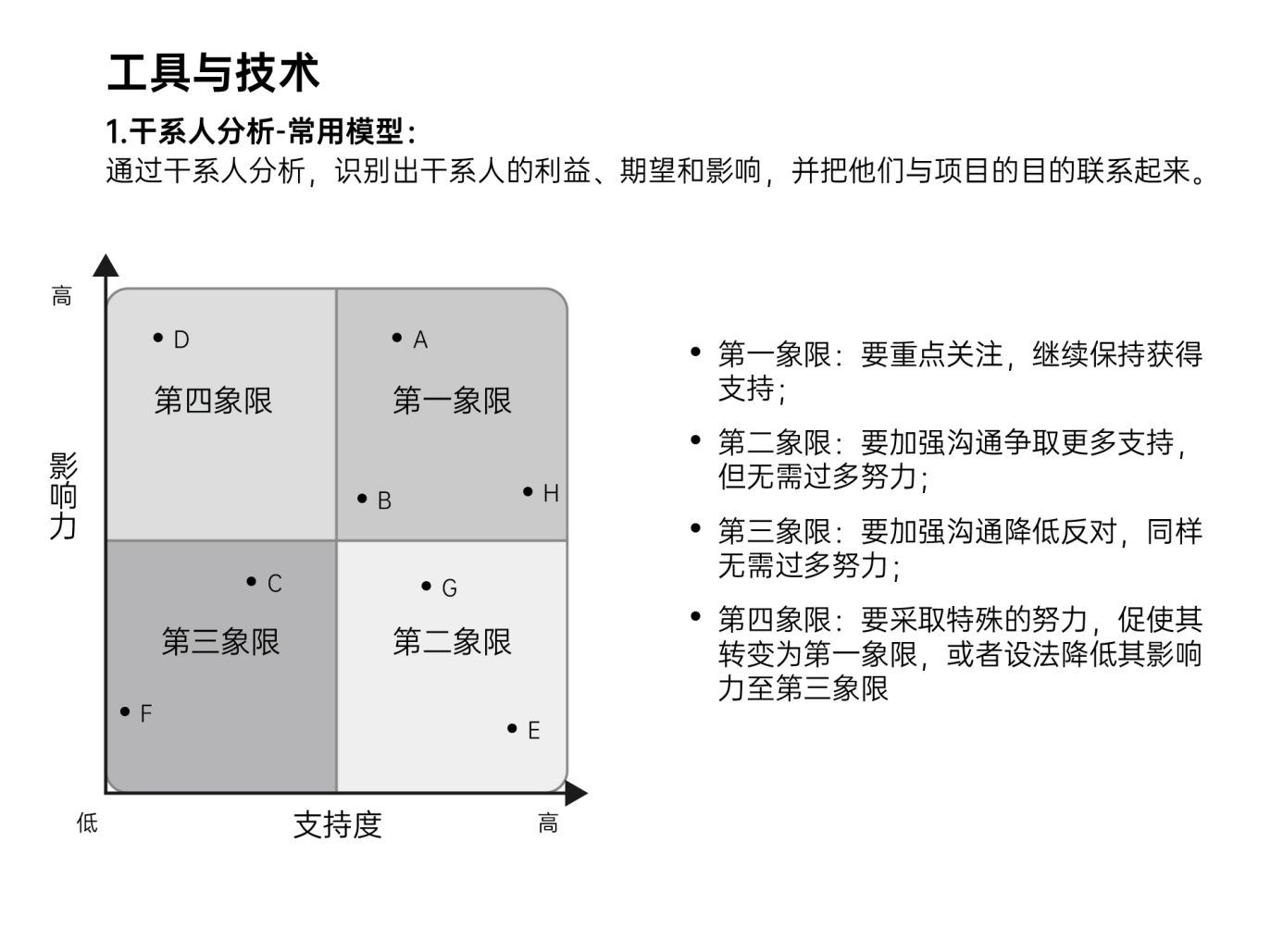 根据干系人的影响力与对项目的支持度,划分为四个象限: