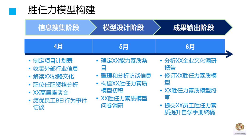 俗话说:“兵马未动,粮草先行。”构建胜任力模型是一个系统性工作,需要人力资源部和相关业务部门投入大量的时间和精力。为了取得更好的效果,需要提前制订工作计划。制订工作计划主要分为以下几点: