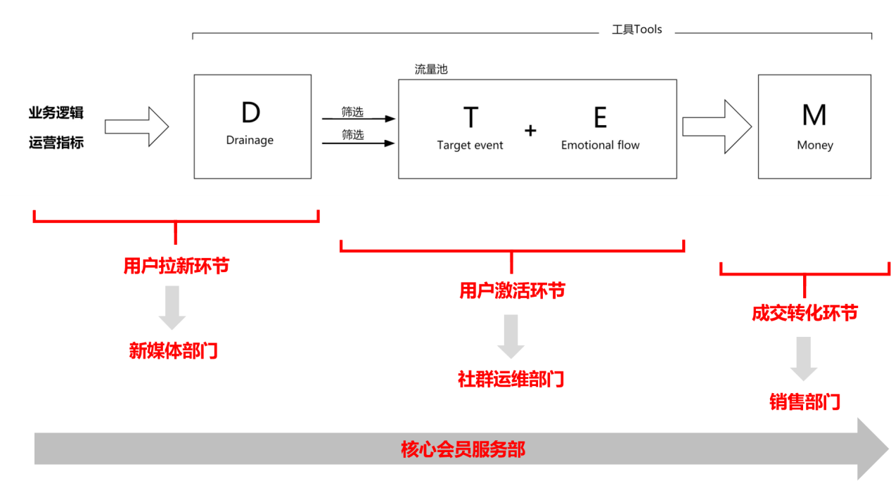 当社群发展到一定规模时,社群营销团队的组建就需要相对比较完善了。在具体岗位的职能划分上也会更加的细致。而具体的划分方式,我们可以根据社群运营管理D-TE-MR模型来进行设计。