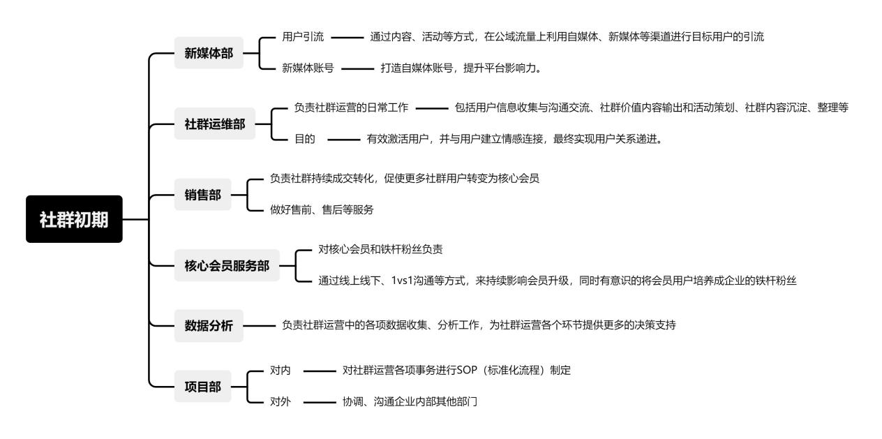 社群营销团队的岗位划分,主要根据企业业务流程梳理和运营指标拆解,以及社群发展的不同阶段进行不同的职能划分。