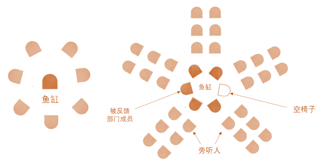 位于会议中心的“鱼儿”自我批评之后,参会者发表观点对“鱼儿——个体或部门/团队”进行诊断和反馈,过程中被诊断和反馈的个人或部门/团队无需辩解、只要聆听即可。此时,位于C位的个人或部门/团队就像鱼缸中供人观赏的金鱼,因此被称为“鱼缸会议”(如下图,左侧为个人反馈,右侧为部门/团队反馈)。