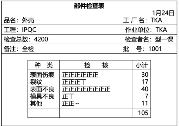 利用统计表对数据进行整理和初步原因分析的一种工具,其格式可多种多样,这种方法虽然较简单,但实用有效,主要作为记录或者点检所用。