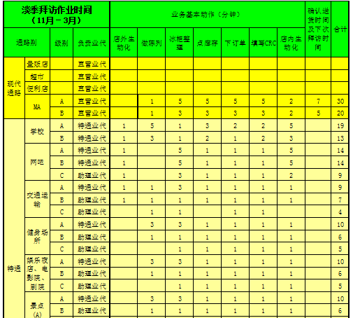 b.淡季(3~10月)各级客户拜访作业时间如表5-6所示。