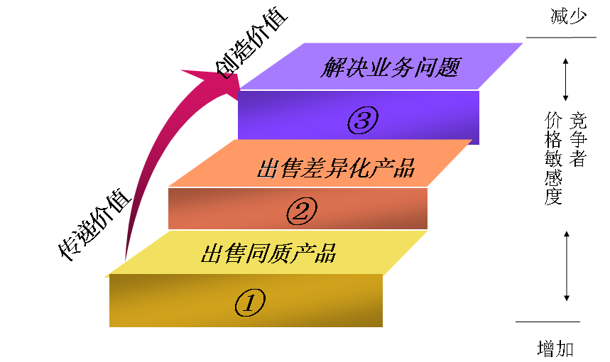 第一个台阶是出售同质化产品,面对的可能是订单客户或客户比较专业。大部分销售人员喜欢订单客户,因为这类客户“短平快”,只要产品、服务符合客户要求,同时能正确地传递产品本身的价值就行了。但是做这样的客户往往面临激烈的价格竞争,因为产品越来越同质化甚至服务都是同质化的,选谁都一样,剩下的是什么?价格竞争。竞争对手多如牛毛,价格没有最低只有更低。