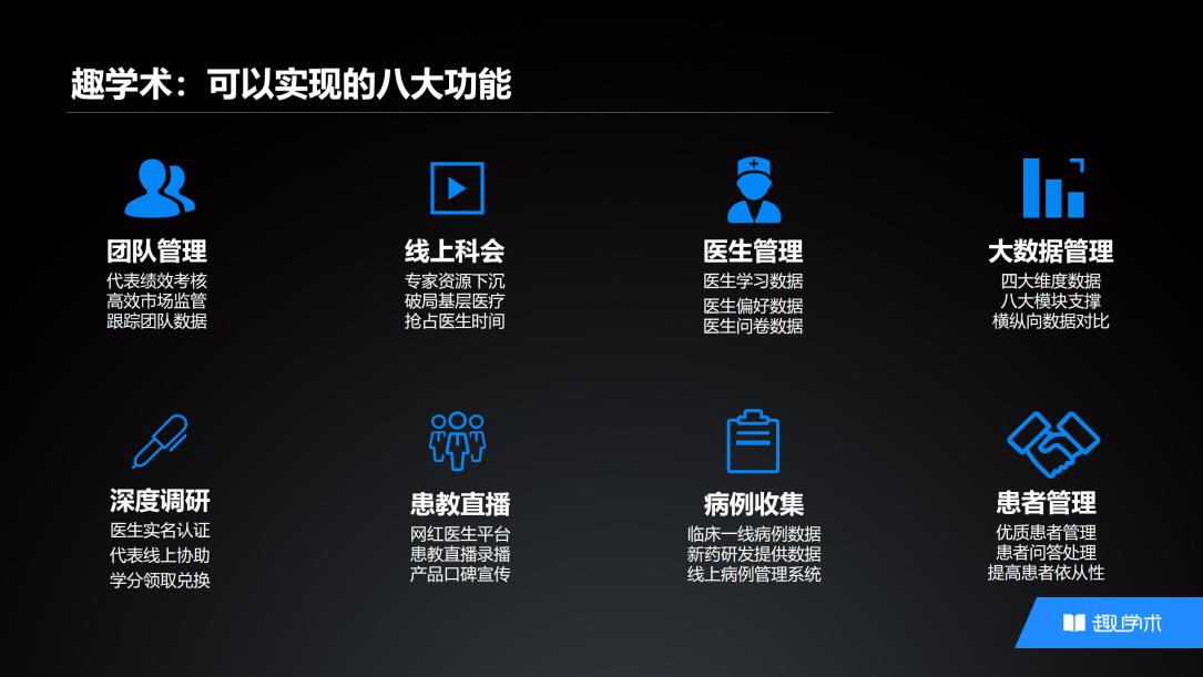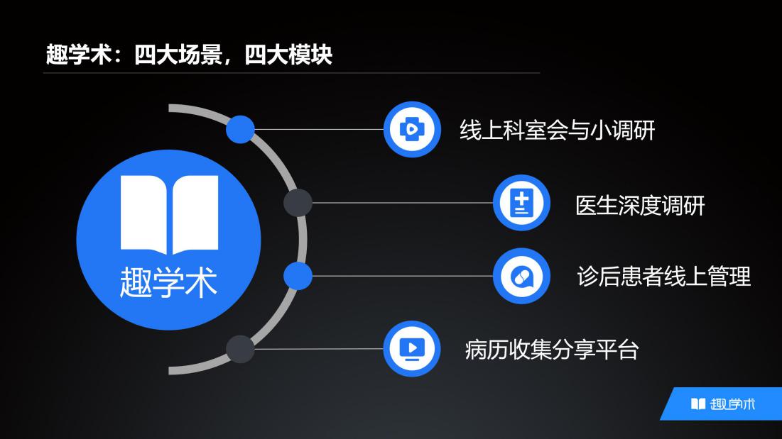 趣宣讲(医生端)、趣科会(代表端)、趣患教(患者端)、趣学术(厂家PC端)。产品以学术传播为核心,从厂家到代表,代表到医生,医生到患者,以互联网技术将线下科室会转移到线上平台,解决从药企到医生的医药学术传播问题。目前已经助力数十家药企做学术推广,经验证,在线化学术会议效率至少是传统线下学术会议方式的十倍以上,而且效果更好。
