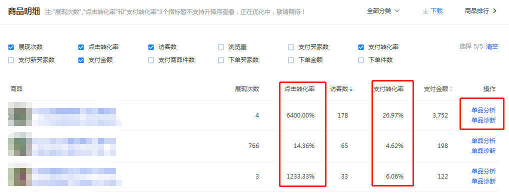 还包括单品分析及单品诊断等,单品选择是选择展现次数多、访客多、浏览多、支付买家数多及支付转化率高的。如图10-16所示。