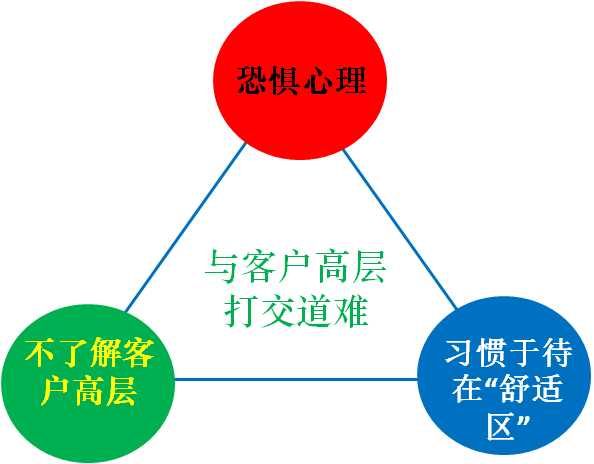 这些与客户高层打交道的看法导致销售人员产生了恐惧心理,他们与客户高层面谈时很紧张,严重时甚至胃也会抽搐、说话结结巴巴,表现欠佳,进而增加打交道的“难”度。