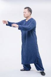 2.上半身维持不动,左脚涌泉向前踩出,重心逐渐移交给右脚,直到右脚全实、左脚全虚。
