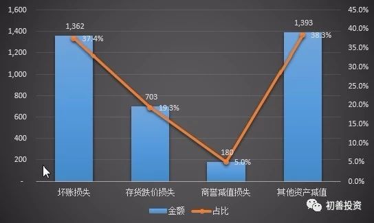扣除银行和非银金融业之外,合计资产减值损失3638亿元,其中坏账损失1362亿元,占比37.4%;存货跌价损失703亿元,占比19.3%;商誉减值准备180亿元,占比5%;其他类型的减值1393亿元,占比38.3%。有其他是因为wind数据库里没有找到具体的类型,不过可以判断主要是固定资产类长期资产的减值损失。如图5-6所示。