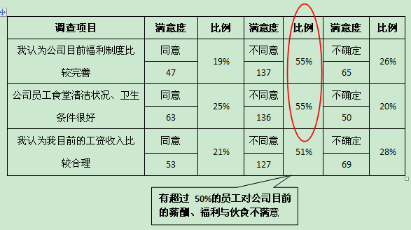 表3-1是公司的民意调查。大家也可以看到,员工最不满意企业的薪酬、福利以及伙食。