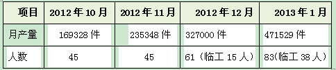 :我们看一下生产数据的变化:如表5-11所示,安包车间人均小时产值,由调研时的407元/小时/人,提升到2013年1月的715.75元/小时/人,效率提升很明显。月产量由2012年10月的169328件提升到2013年1月份的471529件。