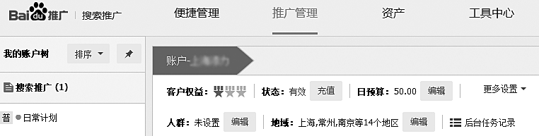 在百度后台点击进入搜索推广模块,再点击【推广管理】,就进入搜索推广的主界面,如图3-8所示。