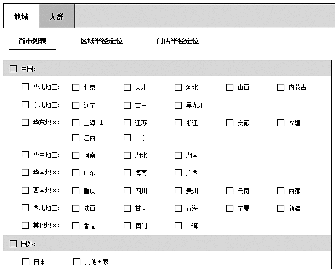 第五项:【地域】。是指整个账户推广的地区,客户可根据自己的实际需要选择地区进行推广。图3-14是可供选择的地区,注意:每个省、自治区还可以选择地级市或区,但直辖市、特区没有下级选择。