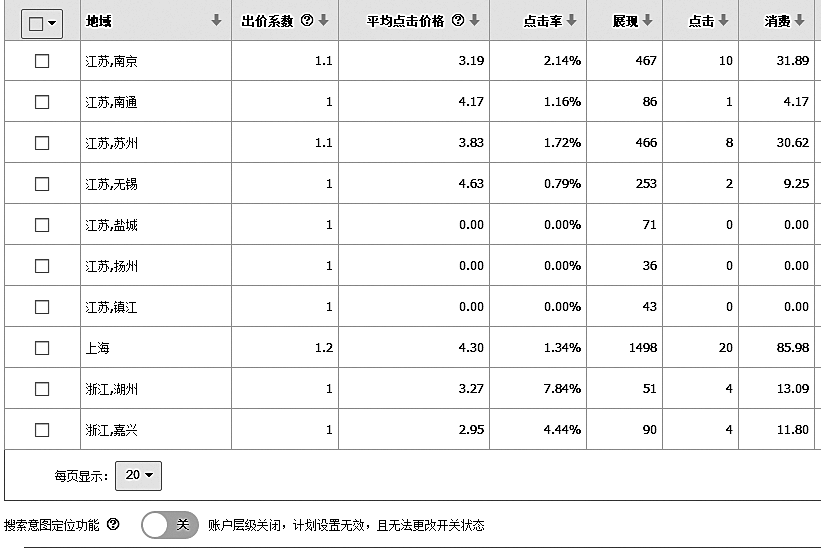 选择好区域后,就会出现图3-15的界面,可以选择不同区域的出价系数。比如在图中的推广区域中,上海地区同行竞争激烈,出价相对高一些,其次是南京和苏州。