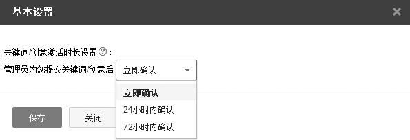 【基本设置】:用来告诉后台系统,一旦提交或者更改了推广的关键词/创意后,多久应当确认生效。以往有的账户管理员总是抱怨自己增加的创意或者关键词,百度迟迟审核不通过,其实是在这个位置没有选择立即确认,如图3-17所示。