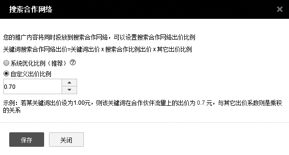 【搜索合作网络】:是指类似于百度内部的贴吧、知道等栏目,外部如58同城等合作伙伴。以我的经验,我的广告在这些平台上推送,效果要差很多,但又无法删除,所以我一般将此出价比例定义到最低0.7倍,如图3-18所示。如果长时间后,确实发现这个来源效果不好,可以向你的百度客服提出正式请求,关闭来自搜索合作网络的广告。